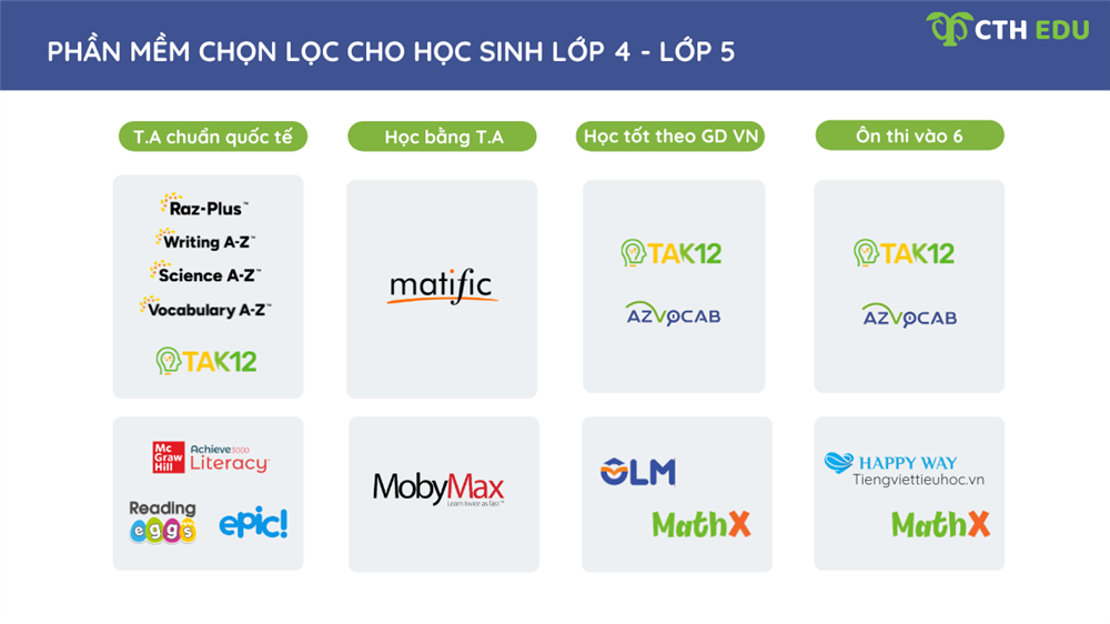 1. TAK12: TAK12.com - Hệ thống ôn luyện thông minh. Giúp học sinh đạt kết quả cao trong các kì thi với thời gian ít nhất. Gói học tốt Toán, Tiếng Anh lớp 4; Học tốt Toán + Tiếng Anh lớp 5 giúp học sinh ôn luyện, củng cố kiến thức theo SGK đã được học trên nhà trường. |