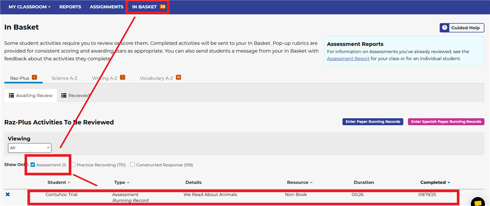 Sau khi HS hoàn thành bài kiểm tra, GV/PH vào tài khoản Teacher sẽ thấy có bài nộp trong In basket. GV/PH vào đó để nghe kết quả ghi âm lần đọc và xem xét kết quả làm quiz của HS: