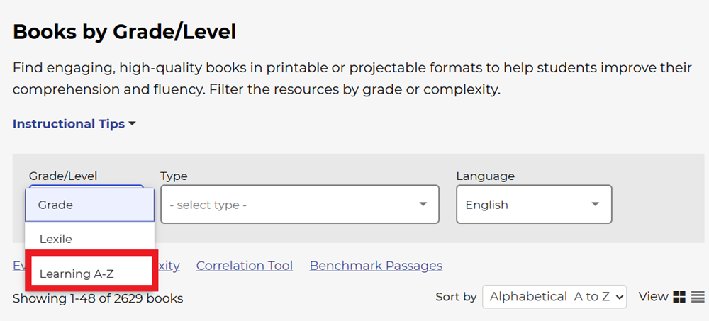 - Bước 3: Tại Grade/Level, chọn Learning A-Z.
