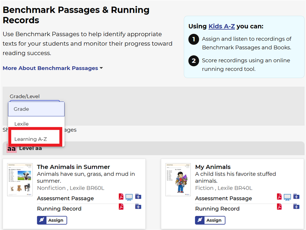 Benchmark passage là phiếu bài đọc mà Learning A-Z thiết kế như tiêu chuẩn đánh giá cho từng trình độ đọc. Để giao phiếu đọc này cho HS, GV/PH đóng vai trò là GV thực hiện các bước sau: